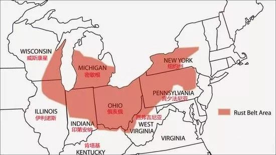 五大湖区的铁锈地带原本是民主党的稳固票仓,结果却在2016年的大选中倒戈,而蓝领工人、高中及以下学历的底层白人则发挥了关键作用。