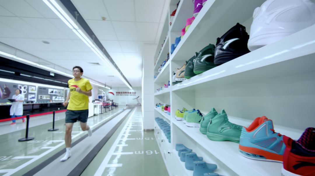 (图为安踏运动科学实验室正在进行运动数据测试,2005年安踏斥资3000万建立国内同行第一家运动科学实验室,一双看似普通的鞋子,可能有着意想不到的科技含量)