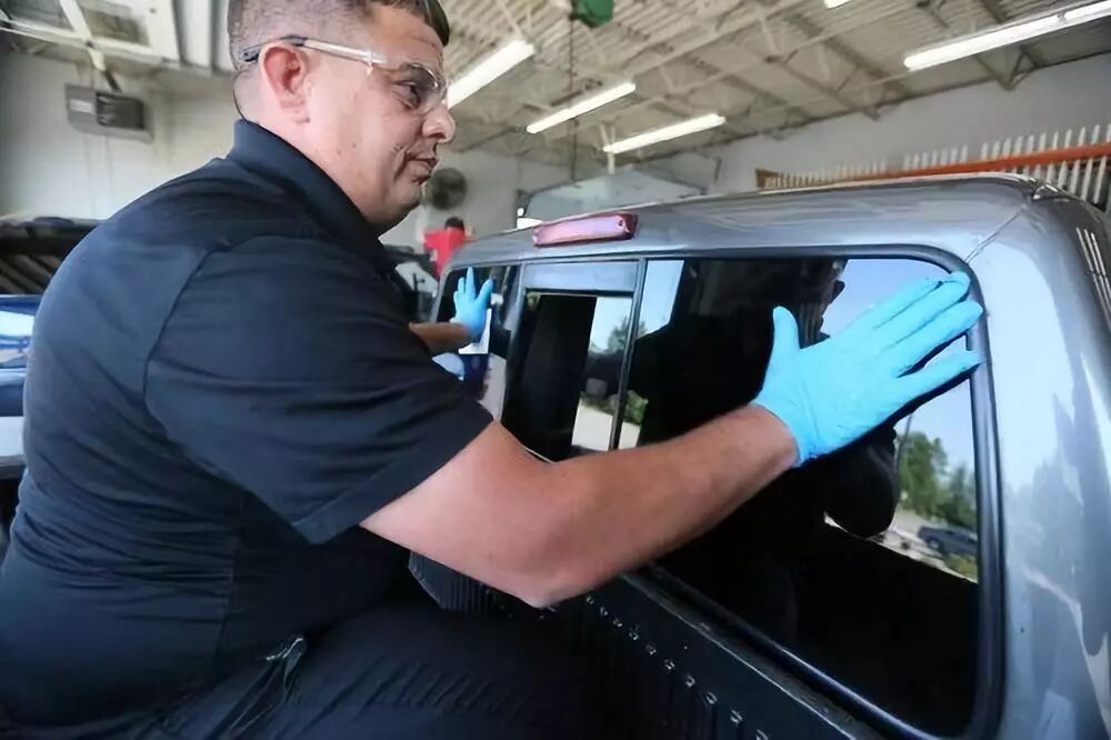 在美国俄亥俄州代顿的一家车行,一名工作人员将福耀玻璃装上一辆汽车。新华社记者张凤国摄