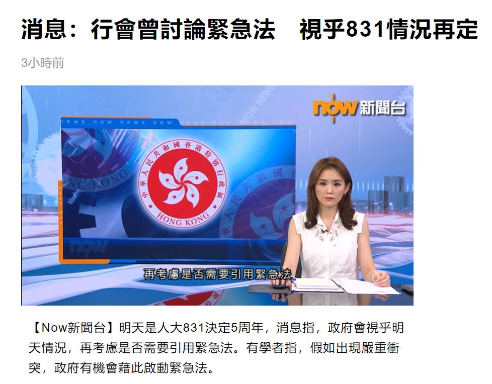 晚间,港媒又报,港府准备视今天情况,以决定是否启动“紧急法”。也就是说,香港又有希望尽早安定。(反对派拟举行“831”示威游行,已被警方反对)