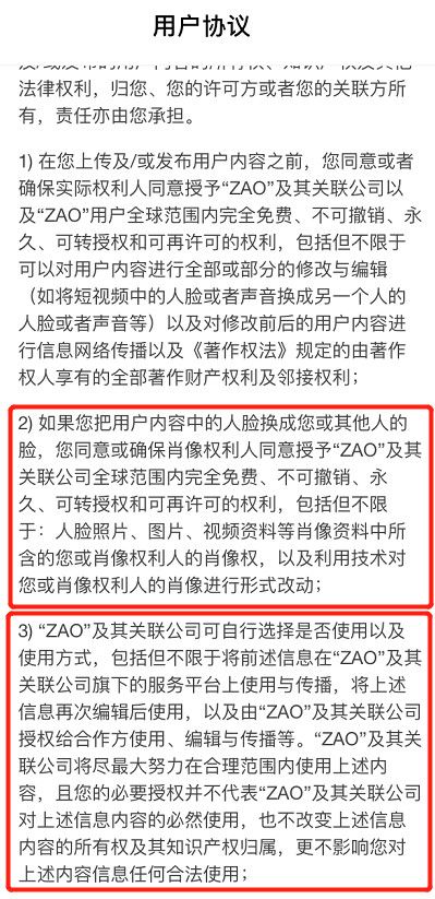 也许你不在意在网上的只言片语,但是自己说的话都不属于自己,这当然是霸王条款。如果所有人都不重视自己的隐私和知识产权的话,互联网公司必定会变本加厉,而且按照合同法,很多情况下他们确实有这个权力,前提是你同意了用户协议。这次,在ZAO的用户协议中,就再次出现了恶心的霸王条款。其中要求,用户上传的所有内容,均可以永久、不可撤销地由ZAO及其关联公司,免费用、随便改、任意传,而且还可以给“合作方”使用、编辑、传播。