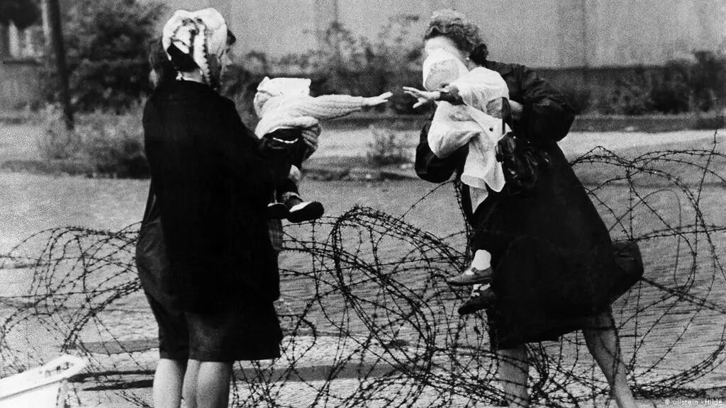 图:被柏林墙分割的德国家庭,隔着边境探望亲人