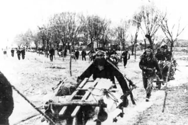 淮海战场上,刚分到土地的农民抢着给解放军送粮食,小推车排了好几公里。