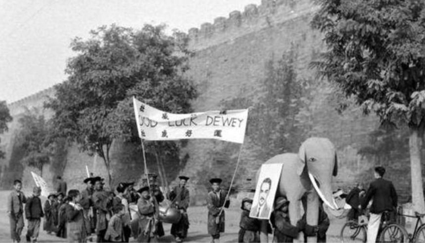 美国大选时,蒋介石派人在北平弄了“支持杜威”游行。队伍所过之处,尽是百姓的骂声。