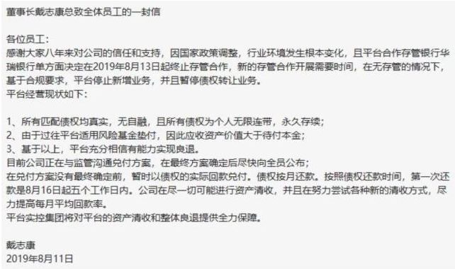 “平台实控集团将对平台的资产清收和整体良退提供全力保障。”“根据政府监管要求,即日起本公司暂停所有的贷款新增业务,保留正常的贷后催收,并决定提前终止本公司总部及公司下属全部分公司人员劳动合同。”