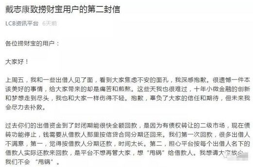 8月26日,戴志康致信捞财宝投资者,表示“不甩锅、不跑路、不失联”:这是戴志康在微博上的最后一条留言,时间停留在2019年6月29日。尽管钱可能是还不上了,但他真的没有跑路,也没有失联,总算还是一条有担当的汉子。