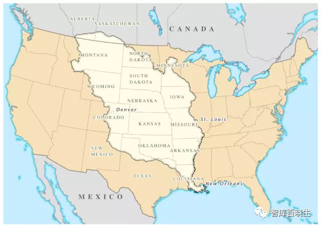 1803年美国买下的路易斯安那(中间淡黄色部分)