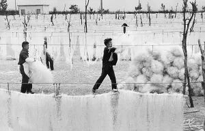 (1988年10月26日,招远市张星镇龙口粉丝基地一乡镇企业正晾晒粉丝,准备出口欧洲 兰培喜/摄 图源:烟台日报)