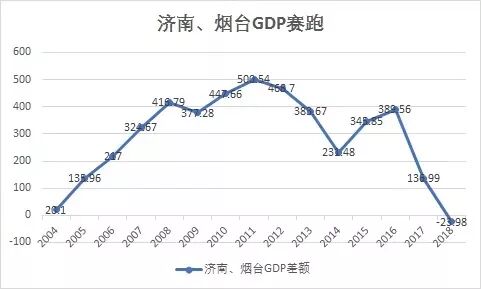 (图为2004-2018年烟台、济南GDP差额 数据来源:根据烟台市、济南市统计局公开资料整理)