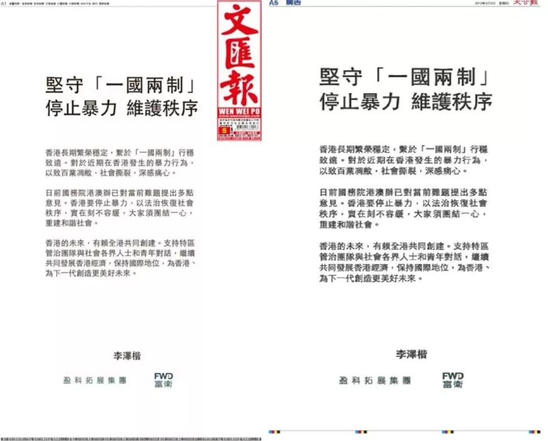 香港《大公报》《文汇报》《东方日报》等多家报纸,昨天(9月5日)同时刊登了李泽楷发的整版广告,标题为《坚守“一国两制” 停止暴力 维护秩序》。这不是香港激进示威持续以来,第一次出现商界人士的广告秀。此前,李泽楷的父亲李嘉诚亦曾于8月16日以“一个香港市民”的名义,在不同的报纸打了两种不同版本的广告。还包括8月27日,正大集团谢国民在各报刊登的“止暴制乱 恢复秩序 维护法治 共促繁荣”等等。