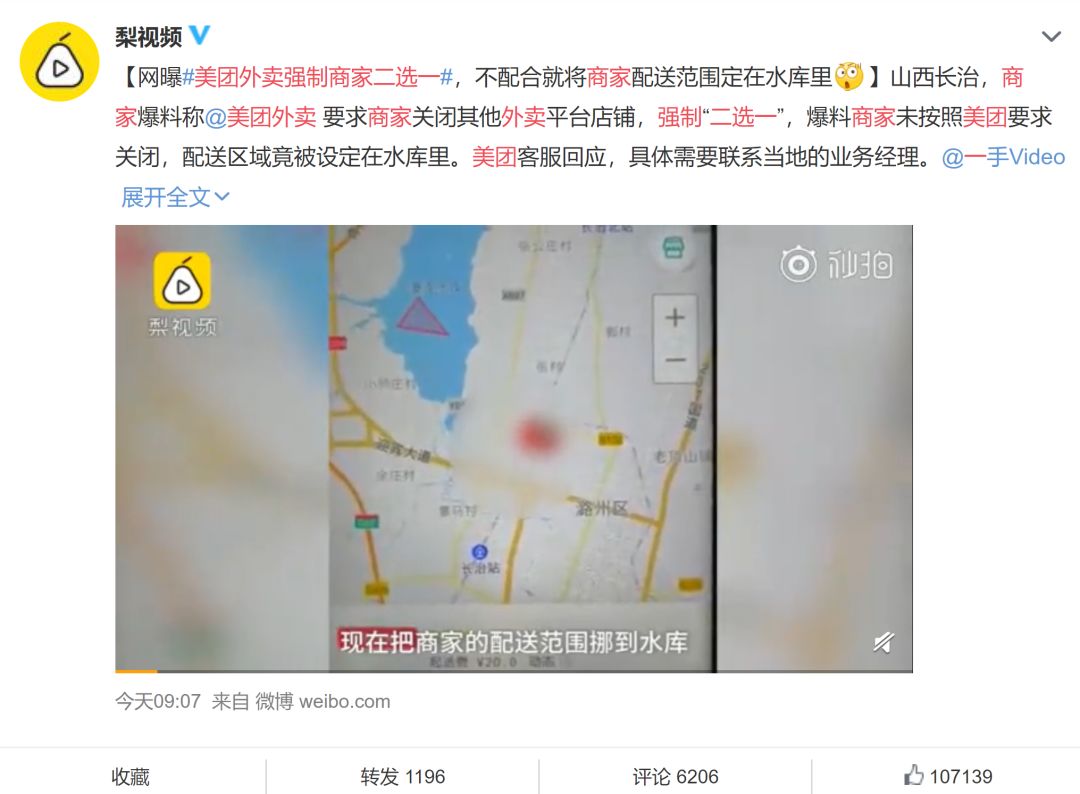 最近在山西长治,有商家爆料称,美团外卖要求商家关闭饿了么,强制二选一,商家没有按照美团要求退出饿了么平台,结果自家的配送区域就被美团设定在了水库里......原本生意红红火火,现在根本无人问津。