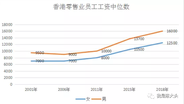 香港零售从业者的工资中位数,2011年为9500元(男)、7000元(女),而到了2018年,分别变为16000、12500元,