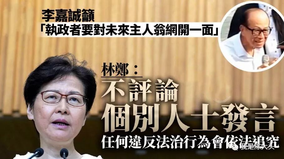对此,特首林郑月娥今日(10日)出席行政会议前,被问及对李嘉诚言论的看法。林郑月娥称,她不评论个别人士发言,法治是香港的核心价值,政府不认同和支持任何违反法治行为,一定会依法追究。 2000年欧洲会议的一份报告,就认为李嘉诚家族垄断香港经济,后面李超人又把半个英国买下来了,一个加拿大人,在香港喊着要给年轻人网开一面,谁又给香港网开一面。