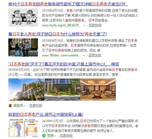 如果你在百度搜索栏打出“日本、养老”这两个关键词,会出现下面搜索结果。