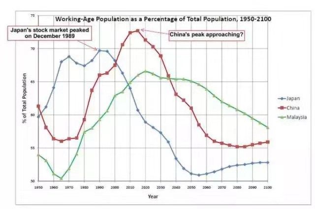 之所以这么在意日本的问题是因为我们和日本在文化和人口结构上有很大的相似之处。都是东亚儒家文化,大家都很上进,生育率低,都在步入老龄化。如果你看过中日劳动人口曲线,可以发现我们的劳动人口变化曲线和日本如出一辙,只不过是推迟了30年而已。