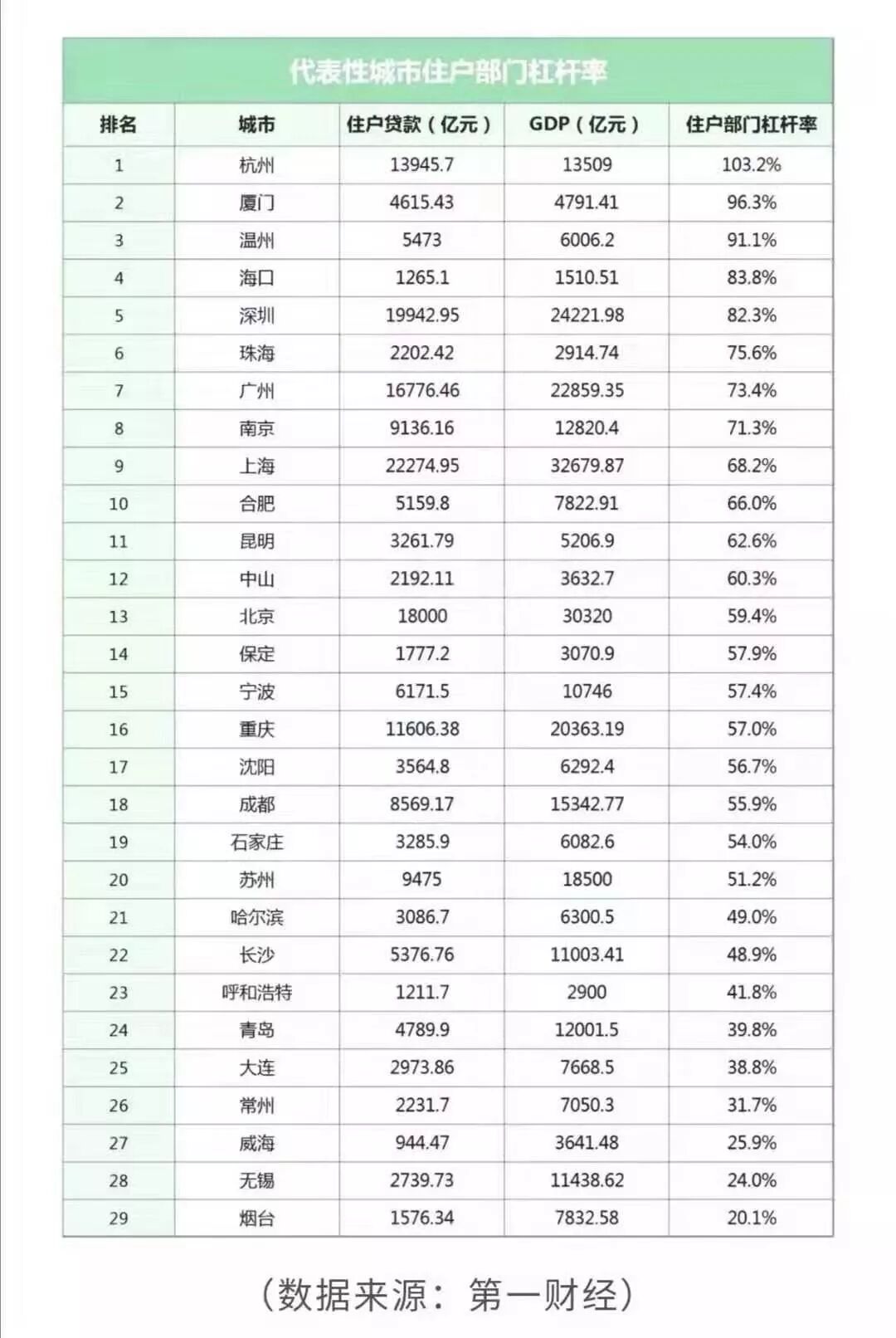 这还是拿居民总债务与GDP进行对比,如果用贷款总额/存款总额进行对比,那么部分城市的杠杆率,更是超乎想象。不难发现,有8个城市的资金杠杆率(贷款/存款)超过了100%:厦门(172.2%)、深圳(144.4%)、杭州(136.7%)、合肥(127.4%)、南京(128.6%)、珠海(124.3%)、苏州(107.5%)、广州(101.9%)