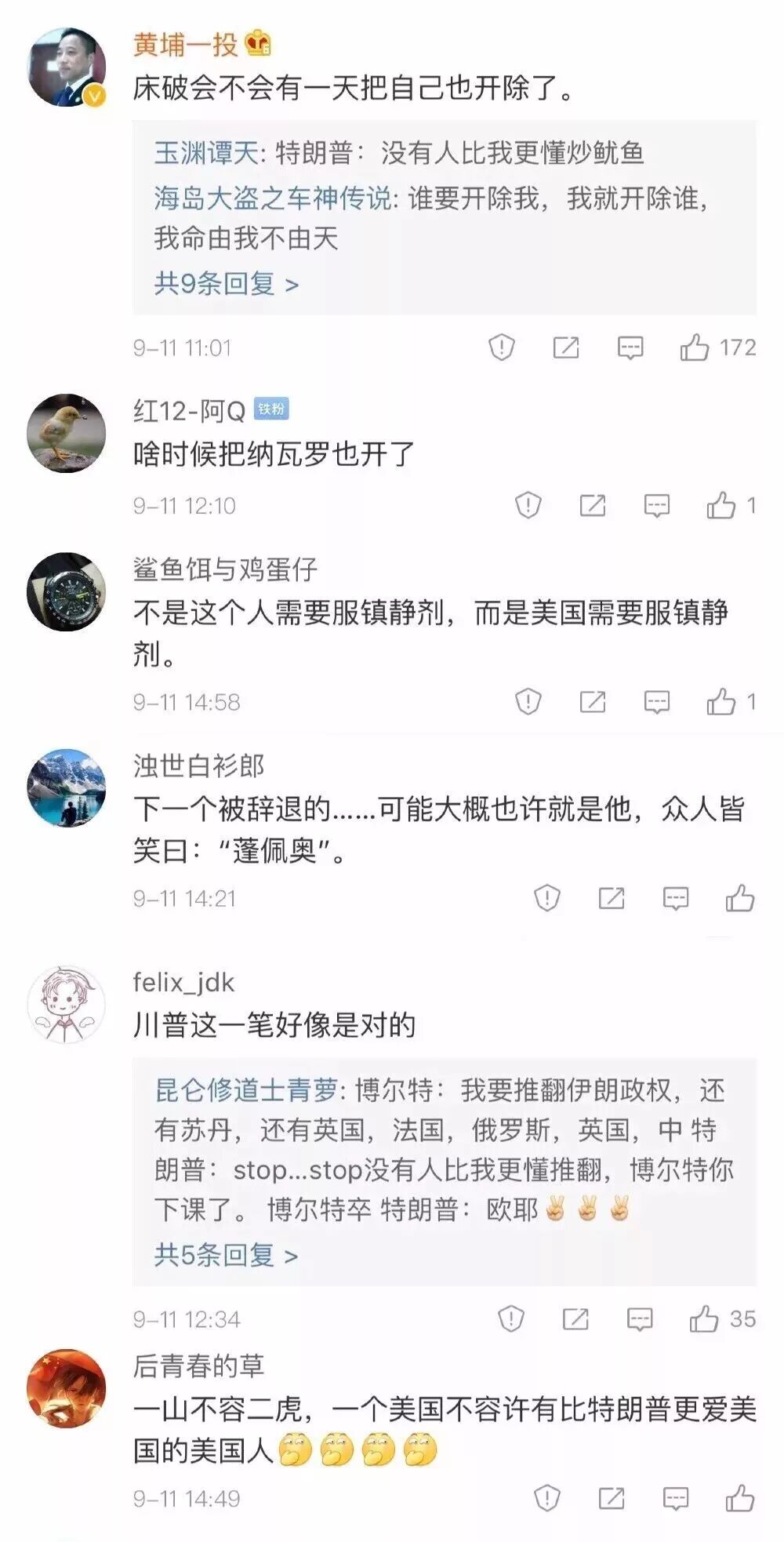 谭主粗粗估算了一下,从弗林到博尔顿,特朗普政府上台以来,被解雇的政府高官、顾问一共32人。这些人的离职原因各异。有因与特朗普政见不合走人的,如蒂勒森、科恩;有因“通俄”被调查的,比如弗林、科米;还有因白宫内斗离开的,比如普里伯斯、斯派塞、班农。