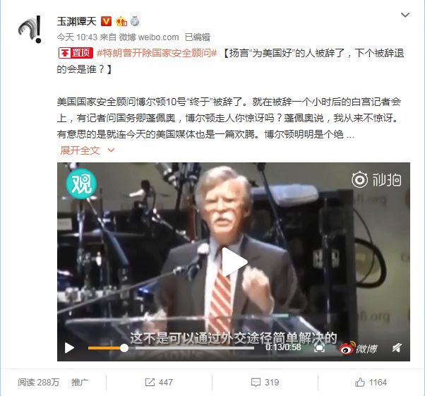 北京时间今天上午,谭主就这事儿在@玉渊谭天 微博上做了一个短评,迅速得到了许多网友的跟进,大家的观点比较一致,都认为国家安全事务助理一点也不“安全”,始终惟恐天下不乱。