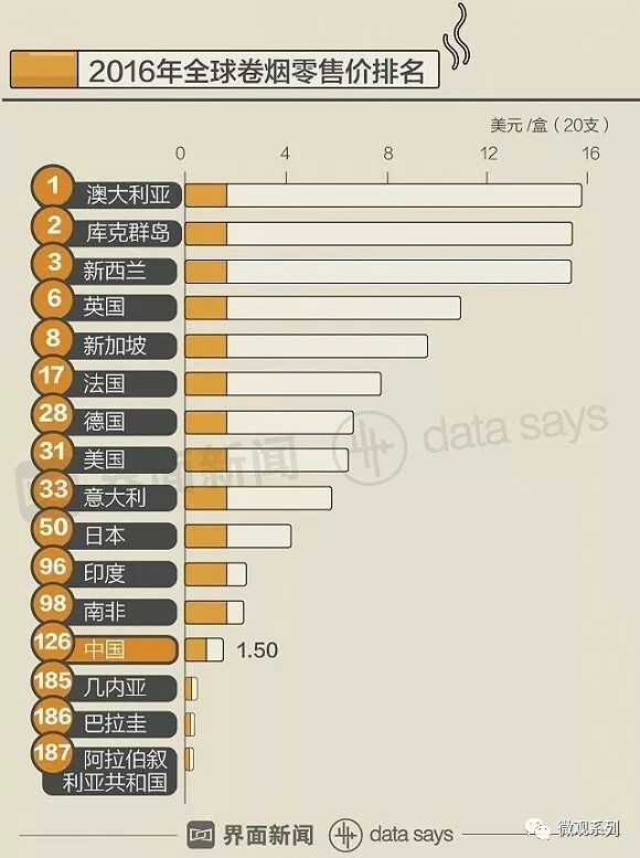 中国烟民平均买一盒烟的价格是1.5美元,也就是10块钱左右。这个一盒烟的平均价格,在全世界所有国家里,位列第126位,是非常非常低的。