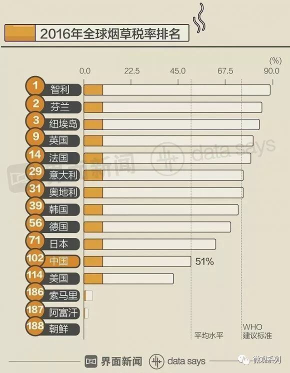 中国烟草税率是51%,属于偏低区间,它和世卫组织要求的,各国应将烟草税率加增到75%,有着一定差距。
