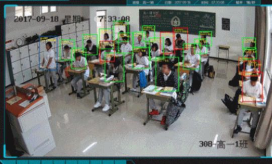 图上绿框里是仰头看黑板的孩子,绿色代表“合格”,而红框里是低头没看黑板的学生,红色代表“异常”。这就是家长们趋之若鹜的专注度识别,AI 会直接根据抬头和表情数据判断孩子是否“专心”。