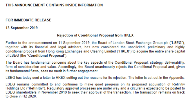 刚刚,英国这个“老狐狸”已经做出决定。据媒体报道,就在9月13日的中秋之夜,当地时间中午12时24分,在伦交所的官网上发布声明称,董事会一致拒绝港交所的收购提议,表示没有必要与香港交易所进一步接洽。
