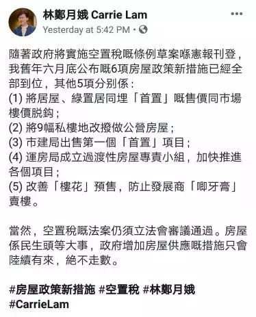 香港特区行政长官林郑月娥,12日晚间在个人社交媒体上透露,特区政府将在政府宪报刊登实施空置税的条例草案。刊宪完成后,自己去年6月公布的六项房屋政策新措施将全部到位。
