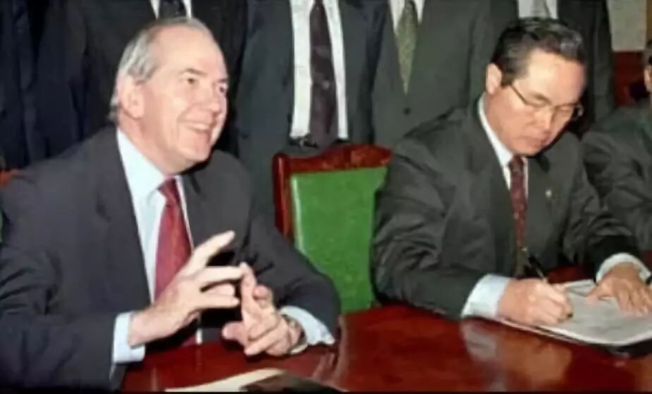 签署协议时的喜笑颜开的IMF代表(左)与面色凝重的韩方代表(右)