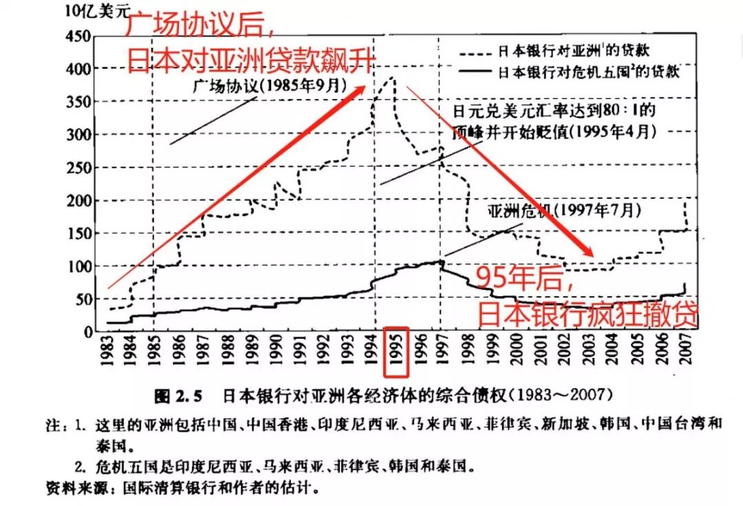 为保住市占率,日本将产业大规模转移到具有廉价土地和劳动力的东南亚。这既可以绕道出口美国减轻保护主义责难,又能通过资本输出缓解日元升值压力,还能在亚洲提高影响力。因经济下行和利率市场化导致同业竞争日趋激烈的日本银行也随之跟进,于是日本银行对亚洲的贷款飙升。