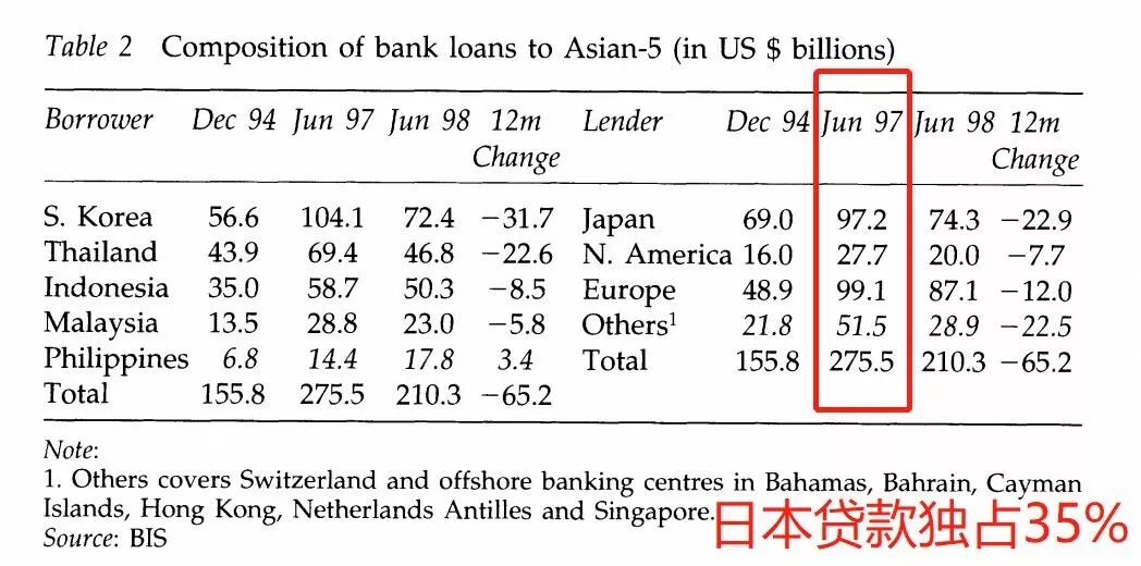 如下表,1997年6月,危机前夕,日本银行贷款在韩、泰、菲、印尼、马来西亚五国总贷款中独占35%: