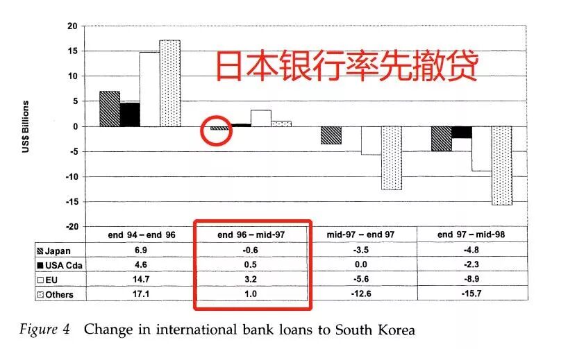 以韩国为例,97年上半年,当北美、欧洲等地的银行仍在向韩国放贷时,嗅到危险的日本银行已经开始跑路,随后各国银行紧随其后夺路而逃,于是韩国外储面临的压力指数级攀升,最终被迫只能向IMF求援,接着就回到了前文我们所说的故事。
