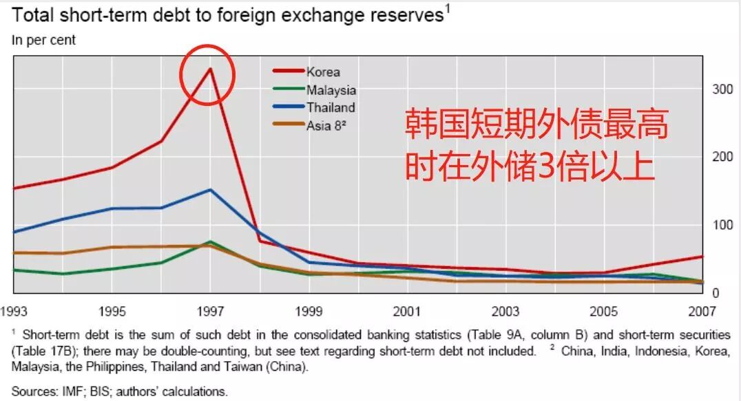 由于政府提供了隐性担保,且更侧重出口的量,所以财阀往往只看规模和市占率,盲目扩张成为常态,导致企业负债率居高不下。1995年,韩国前30家财阀平均负债率高达428%。到1997年,韩国外债高达2000亿美元,其中短期债务就有1300亿美元,而外汇储备却只有300亿美元。