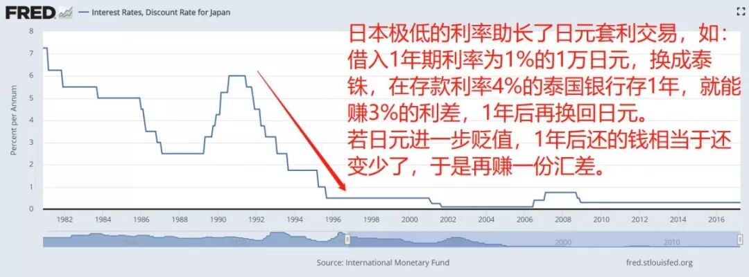 想去亚太发财的并非只有日本银行。泡沫破裂后,日本利率在1995年降至0.5%,此后二十年里都没超过1%。极低的利率使日元套利交易迅速崛起,国际炒家纷纷借入廉价日元,换成当地货币后蜂拥涌入高回报的亚太,由此赚得盆满钵满。一有风吹草动又换回日元准备跑路,这也解释了为什么风险事件发生后日元总是升值。