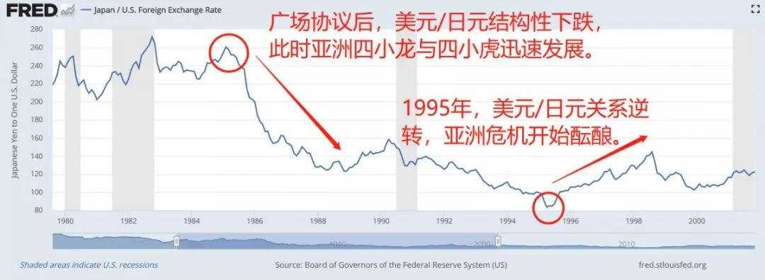 1985年秋,美国为了缓解巨额贸易赤字,迫使日本与英法德与其签订《广场协议》,之后美元大幅贬值,而日元则在不到3年内对美元升值一倍,出口竞争力大大受挫。
