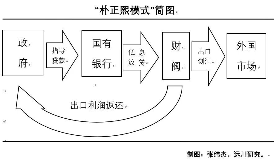 1960年代,政变上台的朴正熙勒令银行按指导向财阀发放低息甚至负利率贷款,谁不听话谁坐牢。拿了贷款的财阀必须努力扩大生产,完成政府规定的出口数量任务,否则以后能拿到的银行贷款就会减少,倒逼财阀拼命出口,由此把韩国打造成了堪称外汇收割机的出口机器,其运作如下图: