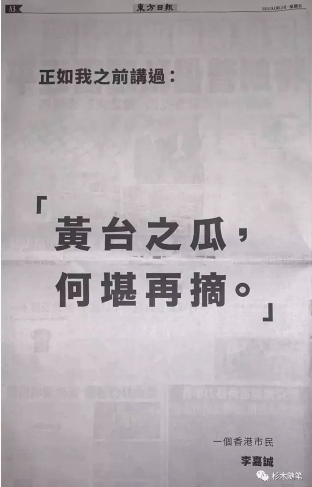8月16日,在香港反修例暴乱两个多月后,迫于民意,李超人首度发声。分别在明报和大公报等多家报纸以“一个香港市民”的身份,刊登两个不同的广告: