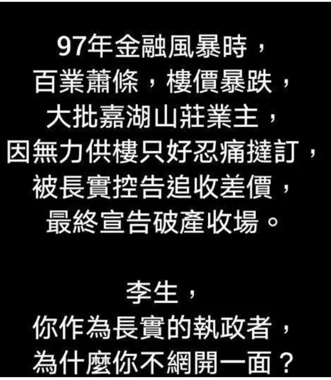 特首不评论,但网友的评论却一针见血。有网友回忆起1997年亚洲金融风暴时,李超人恪守法治契约精神,坚持向小业主追债,他们向李首富发问:怎么当年没见你给香港市民“网开一面”?