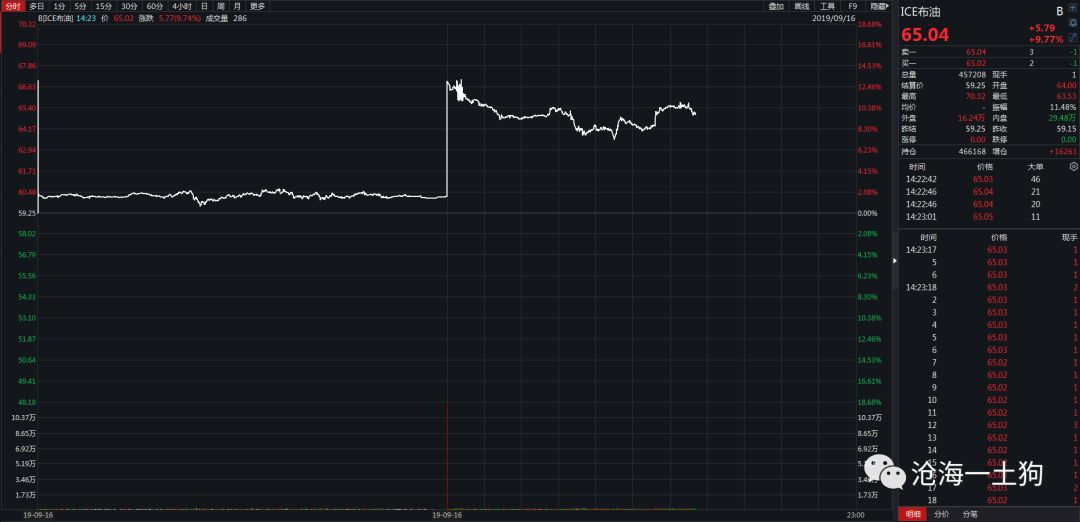 中秋期间最大的新闻,应该是“沙特油田被炸”这一条新闻了。受它的影响,周一布伦特原油大涨,价格走势如下,