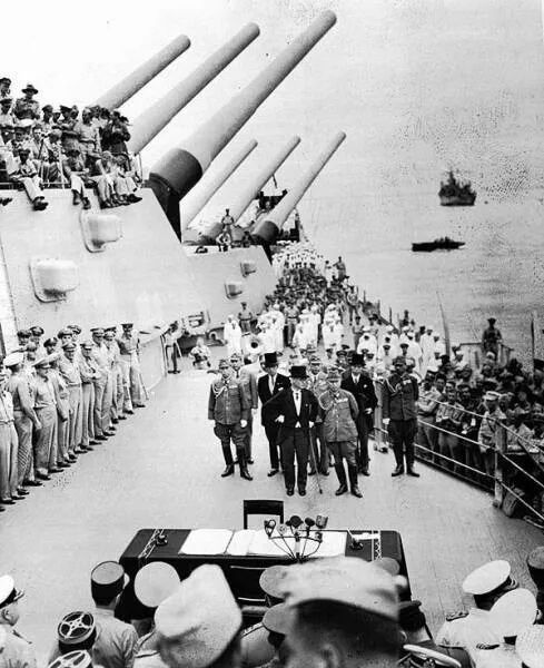 1945年9月2日,日本无条件投降签字仪式在“密苏里”号战列舰上举行。