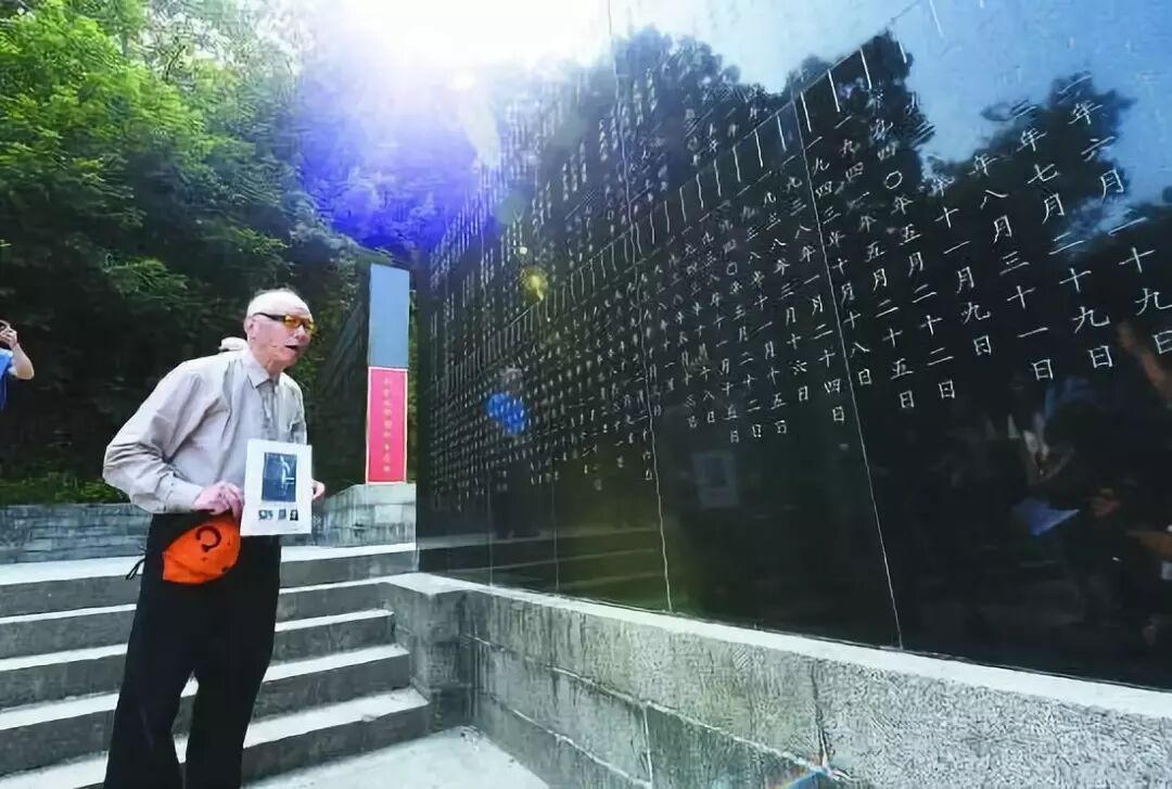 9月2日,抗日航空烈士顾梦飞之子顾岁荣在补刻有顾梦飞名字的新碑前凭吊。当日,南京市各界400多人在南京紫金山麓的抗日航空烈士纪念碑广场参加凭吊抗日航空烈士仪式,补刻990名烈士英名的新纪念碑同时揭幕。新华社记者 孙参/摄