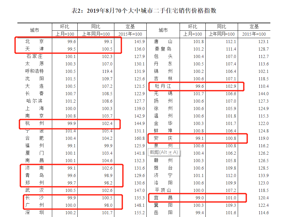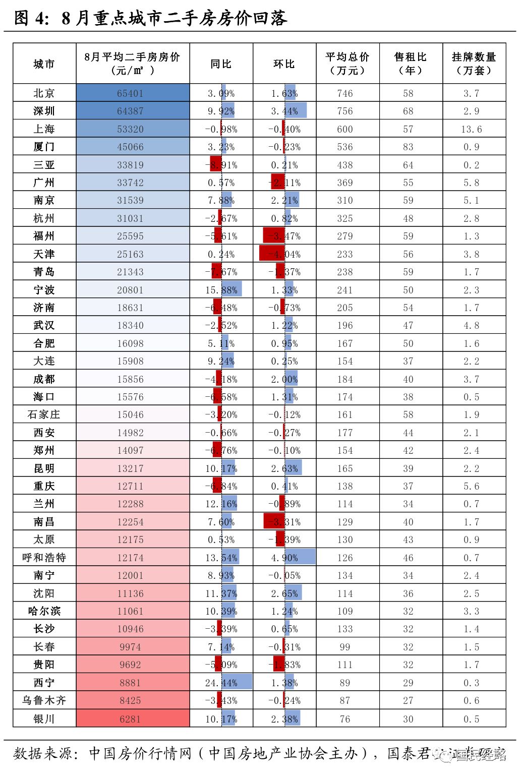 可以看到,跌幅最大的为广州,但也仅仅下滑-2%,大多数城市都与去年基本持平,这说明这一年我国楼市基本处于高位横盘状态。不过,值得一提的是,最近两个月,全国楼市盘整的城市增多,超过1/3城市二手房房价不再上涨,这一数字创出2018年以来的新高。如果说官方统计数据存在失真,那么不妨引入市场数据作为参考。根据国泰君安的整理,在受监测的36 个城市中,8 月重点城市二手房房价回落,与此同时当月挂牌量相较7 月均全面回落。这其中,有16 个城市二手房房价出现同比下跌,和 7 月持平。这16个城市分别是: