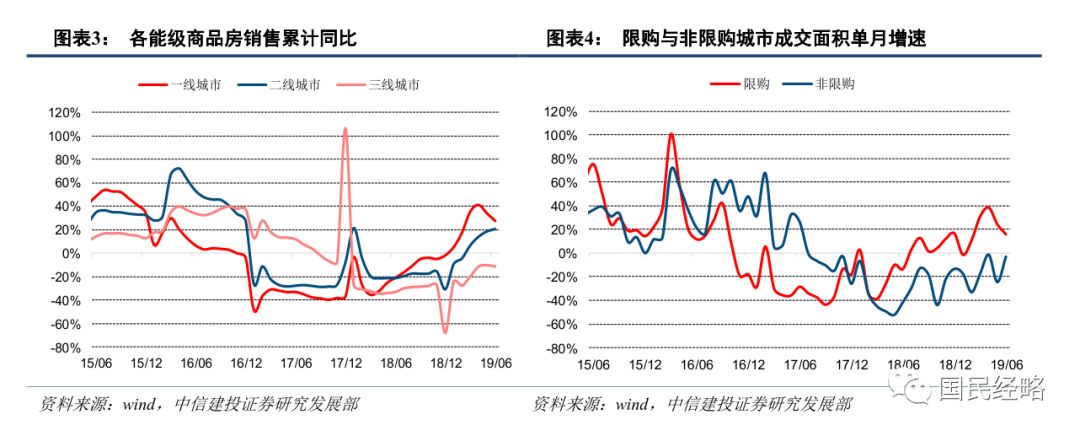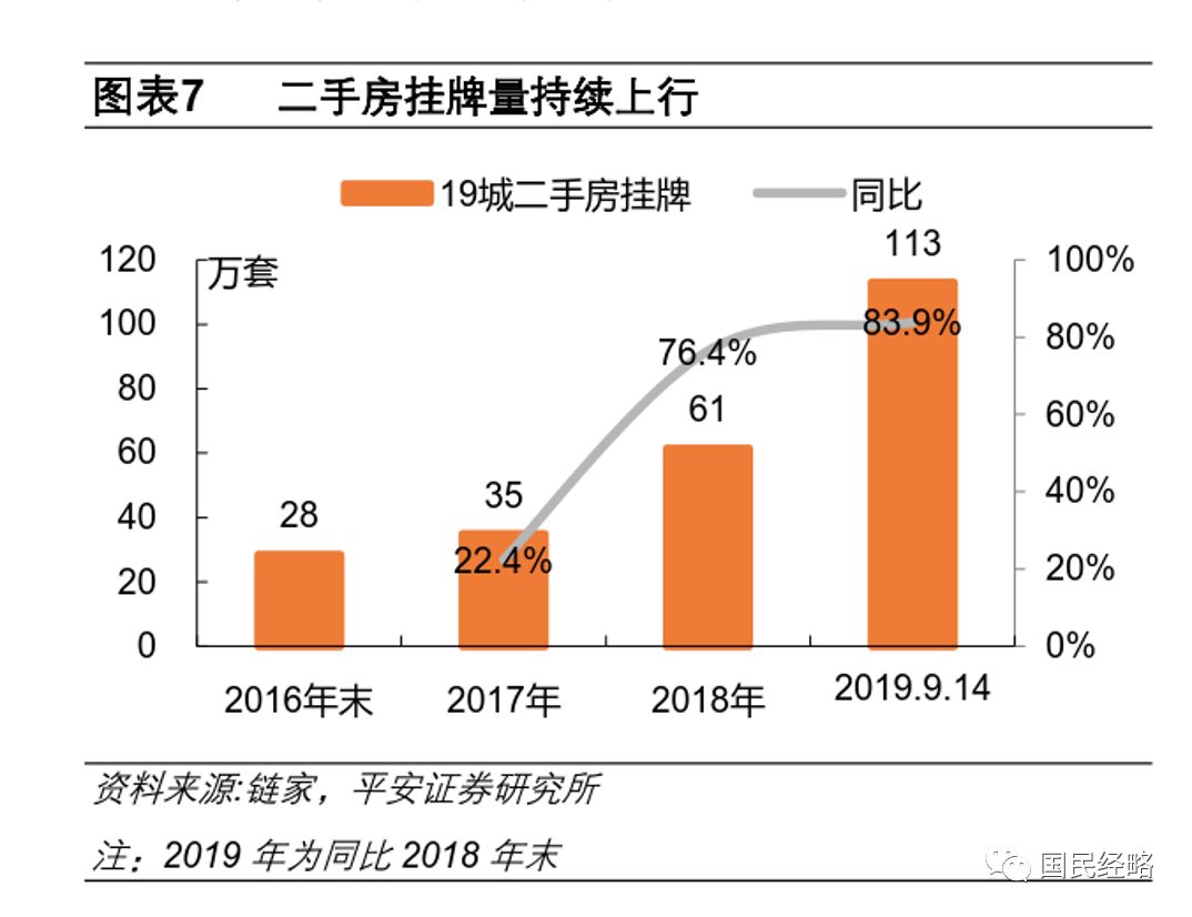 这其中,二手房房价同比跌幅前五的城市分别是:三亚-8.91%、青岛-7.67%、重庆-6.84%、郑州-6.76%、海口-6.58%。值得一提的是,相比房价下跌,更值得关注的是成交量全面收缩,以及二手房挂牌量大肆井喷。据易居研究院,8月13城二手房成交量为7.9万套,环比下降8.5%,同比增长0.9%,成交量处于2019年5月以来的下行通道。与此同时,二手房挂牌量创出新高。仅以链家平台为例,截至9月,19 城二手房挂牌 112.9 万套,相比2018年大涨83.9%,接近翻倍;与2017年的35万套相比,翻了3倍多。其中,重庆、成都、武汉、杭州、广州等地的二手房挂牌量纷纷创出新高。重庆高达11.4万套,成都10.8万套,武汉10.1万套,杭州5.3万,广州5.9万套,相比去年同期全部翻倍。二手房挂牌量创出新高,而成交量不涨反跌,部分城市房价已经开始下探,这是再真实不过的市场信号。说了这么多,似乎只有一二线城市房价横盘乃至下跌,三四线似乎仍在上涨?首先,房子在城市之间存在轮动效应。2015年-2016年,一二线城市率先上涨,而当时三四线仍受高库存之累。直到2017年,在棚改货币化和一二线楼市调控持续收紧的双重作用之下,三四线城市房价才重启上涨之路。这一轮调整也是如此。2014年最早上涨的厦门,在2018年率先遭遇调整;2015年率先上涨的北京上海,在2018年也横盘了一年之久。三四线同样如此,这是楼市规律所在。其次,不同城市启动时间不一,有些城市直到2018年才启动,而这时一二线城市已经攀升到历史高点。所以,从同比来看,这些三四线城市似乎仍在上涨,但这是一种假象。事实上,三四线城市成交量已经开始下滑,且下滑力度超过一二线城市。熟悉楼市周期的人都知道,量在价先,成交量下滑是市场转向的标志性信号。数据显示,中信建投从跟踪的 50 个重点城市来看,上半年一、二、三线的累计同比分别为 30.74%、22.84%、-9.09%。易居的月度数据也证明了这一点。今年8月,18个三四线城市新建商品住宅成交面积同比下降17%,降幅超过一二线城市。