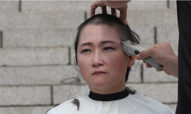 日前,一名叫做李彦周的女议员在国会前剃光头,以示抗议。她流下眼泪,呼吁政府撤回任命,要求文在寅公开道歉。
