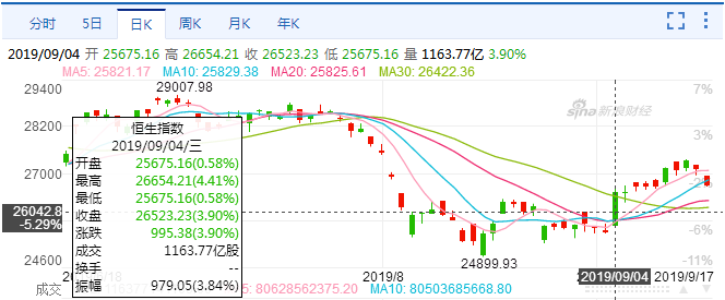 9月4日,香港特首林郑月娥提出了四项行动,促进香港政局稳定。市场立刻得到响应,当天恒生指数拉升了近1000个点,涨幅高达3.9%。