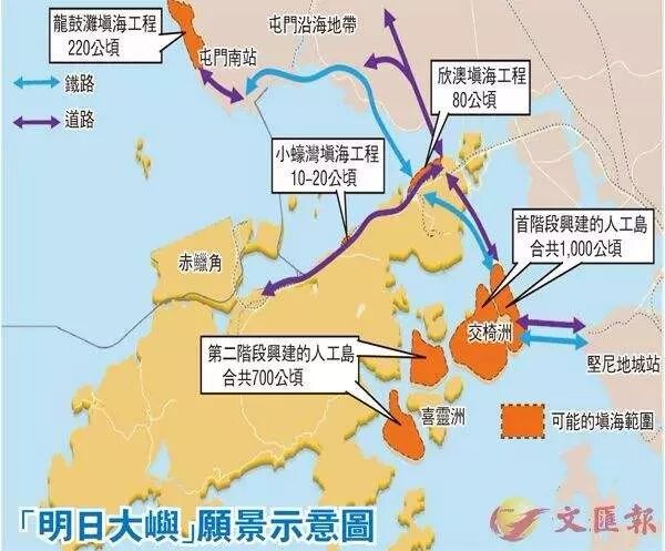 我们可以算一笔账。如果收回土地超过700公顷,70%用来修建住宅(其余为配套设施),按照大约4倍容积率计算,每套住房建筑面积70平方米,则可以修建28万套住宅。假设这些住宅能分7到8年推出,则每年可以增加3万多套住宅供应。但说实话,按照香港的法律制度,收回闲置土地会产生很多争执。特区政府必须以很大的决心,才能推动。此外,香港此前还公布有“明日大屿”填海计划——将在大屿山东侧水域及屯门龙鼓滩填海,建造人工岛屿,可获得新土地面积约 1700 公顷。大约可以建设26到40 万个住宅单位,可容纳 70-110万人口居住。(见下图)