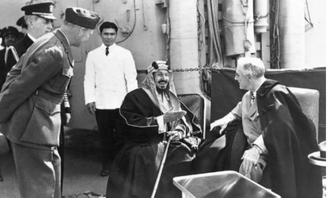 1945年,罗斯福从雅尔塔会议返程的时候,特意邀请阿齐兹国王登上了美国军舰。俩人一个坐着轮椅,一个拄着拐杖,促膝长谈。