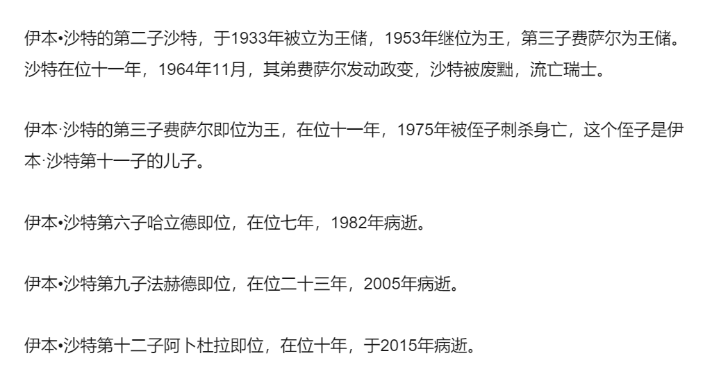 沙特王位兄弟相传有个问题——这些兄弟太多了,能不能当上皇帝全靠活得长不长,传到后面的国王时,个个上台时都垂垂老矣。而台下都是年富力强的弟弟、子侄辈,难免对王位不动心。