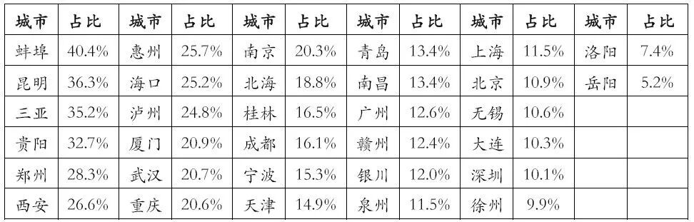 就城市来说,蚌埠、昆明取三亚而代之,成为房地产依赖度最高的城市。蚌埠依赖度高达40.4%,昆明为36.3%,三亚为35.2%,海口仅为25.2%。