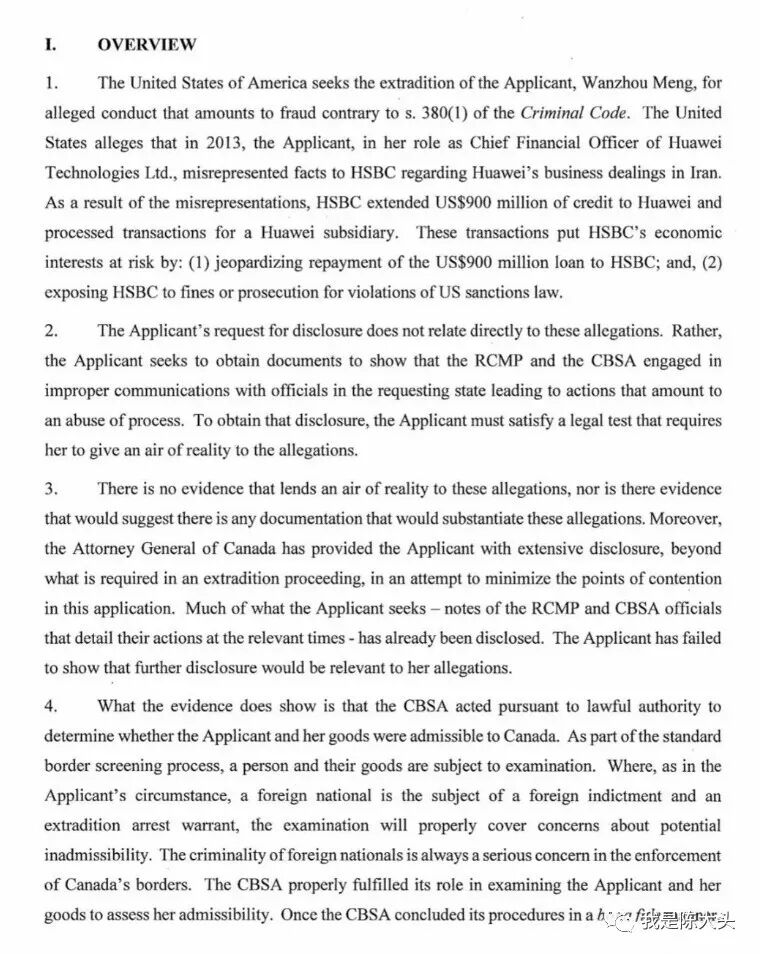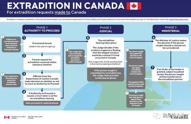 加拿大司法部制作了一张简易引渡流程图,引渡流程总共分为七步:目前,孟晚舟的引渡还处在第五步,本次为期8天的审讯是信息披露申请聆讯,正式引渡聆讯最快要到明年1月才开始。在这一阶段,法官的审议并不代表当事人一定会最终被引渡。当事人可以对判决结果提出上诉、申请司法复核、或者同时做出这两项申请。即使到了司法部长复核,也能进行司法复核,只有在穷尽所有法律途径后,被引渡人才会被移交至申请引渡的国家受审。如果孟晚舟能够在整个司法链条中获胜一次,不论是初审、上诉、还是司法复核,孟晚舟都可以重新获得自由。 在9月23日的庭审阶段,双方是关于信息披露申请的聆讯。比如,美国起诉原因之一,HSBC给了华为以及子公司9亿美金贷款,之后公司的所作所为有损美国利益!而孟晚舟的律师团队展示了上万份电子邮件,指她被捕前的11月30日晚间,加拿大皇家骑警与美国FBI有电邮往来,据悉公布的文件达1,150页,拘捕过程全部有CCTV录影,可以证明孟晚舟在温哥华机场遭拘留和逮捕过程是在美国指导下进行的,涉嫌滥用和违法,故而认为加拿大海关执法不当。