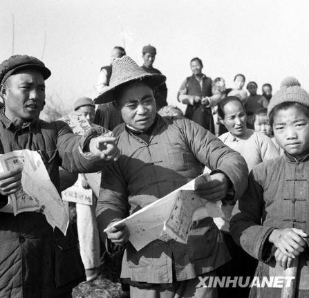 1950年,土改工作队的工作人员(左)带领农民进行分田(图片来源:新华网)